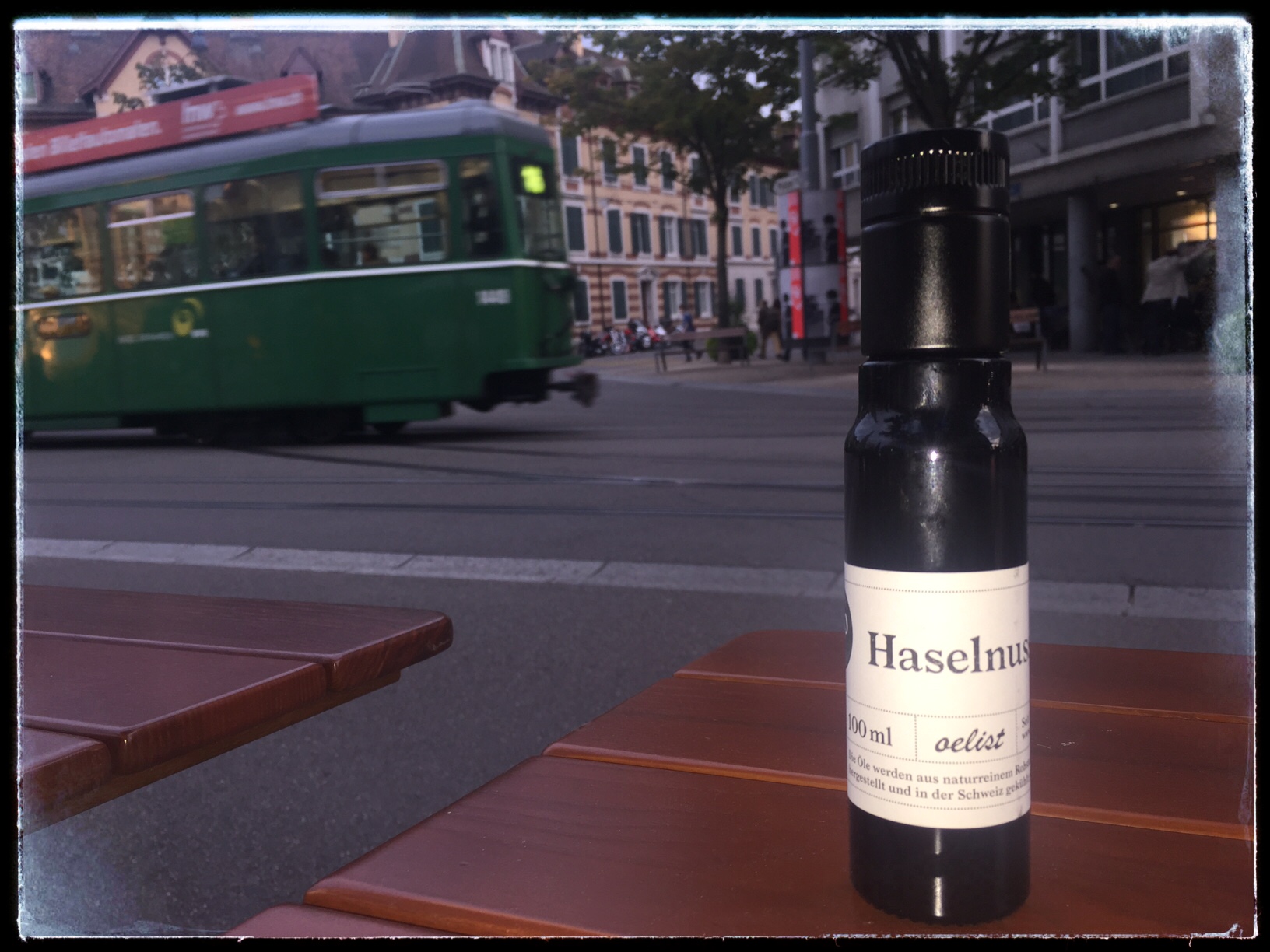Mitbringsel Starke Strecke Basel Güterstrasse: Bio-Haselnussoel, hier noch jungfräulich am Tellplatz. (Bild: DerInternaut.ch)